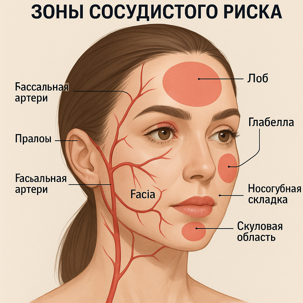 Важно: периостальное введение снижает риск эмболизации по сравнению с поверхностными инъекциями, однако не исключает его полностью — особенно в зоне носа и межбровья.