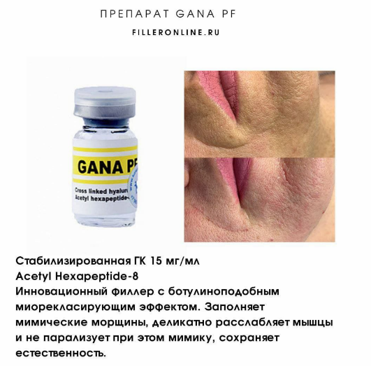 GANA PF предназначен для коррекции мимических и мелких морщин периорбитальной области, в том числе "гусиных лапок", а также для коррекции морщин в области лба и губ.